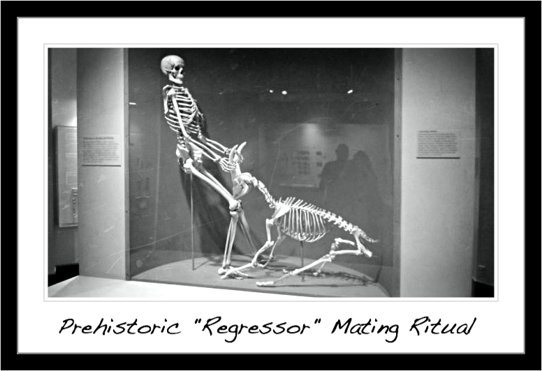 Darwinism may have (mercifully) passed these amiable sheep-lovers by, but in my vast wanderings upon the Internet I unearthed a photograph of a rare exhibit of fossilized remains of the earliest knownpracticingof the “Regressor Mating Ritual.”